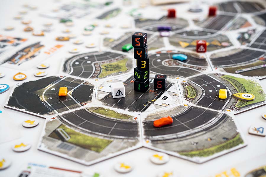 Each die has a certain number of Warning symbols. If you get 3 in one roll, you’ll spin out! Losing control of your car will lose you time and distance, and even causing damage to your vehicle!