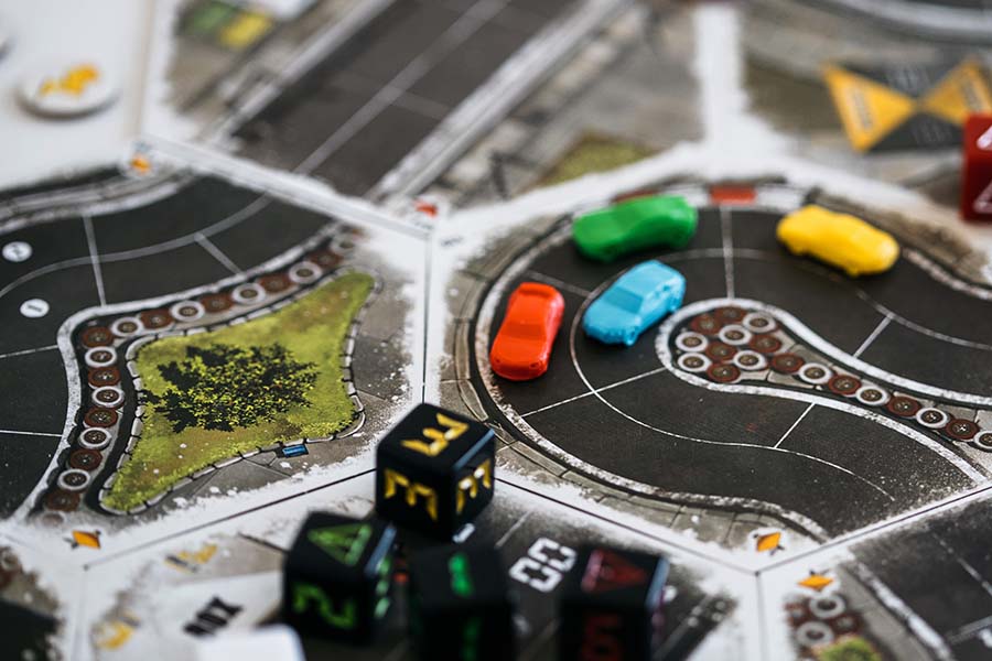 You’ll also have to deal with dangerous road sections and sharp corners, which have speed limitations and other special conditions. Plan your trajectory carefully at the start of your turn to cut across corners and save time, but watch out for other players! Your opponents can maneuver to cut you off, forcing you to take more dangerous routes to get ahead…
