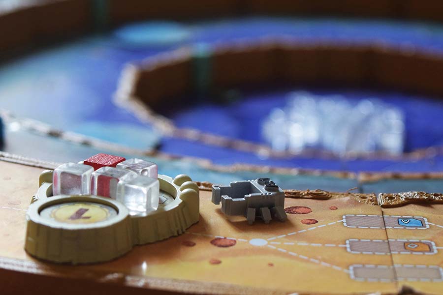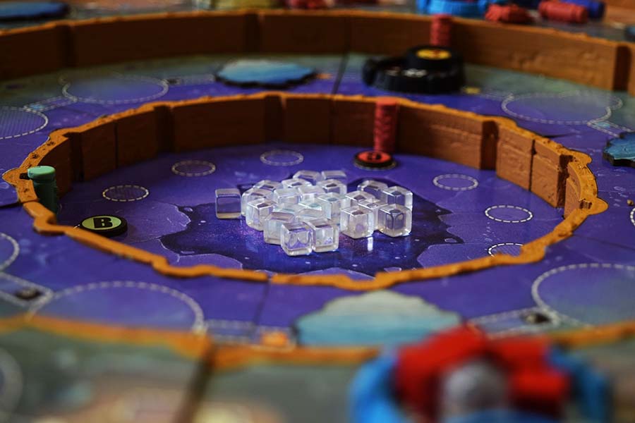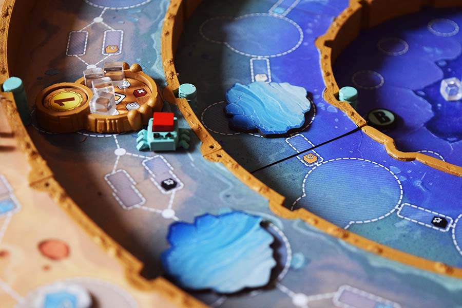 As a Stardrill employee, the aim of the game is to earn as many Credits as possible by the end of the game’s 5 rounds! The main way to earn Credits is by mining resources from Titan’s crater, represented by the game’s 3D board.